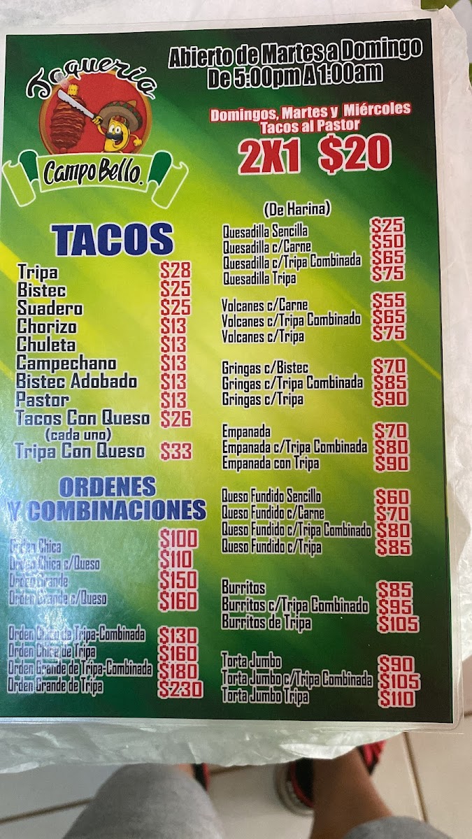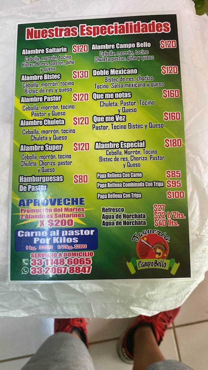 Introducing the menu at Taquería Campo Bello, nestled in the heart of Bauhina 5, Fraccionamiento Campo Bello, this Mexican eatery has earned rave reviews for its exceptional flavors and generous portions. Customers repeatedly highlight the excellent taste of the dishes, especially the beloved alambres especial. With a focus on freshness, every bite bursts with flavor, making it a local favorite.